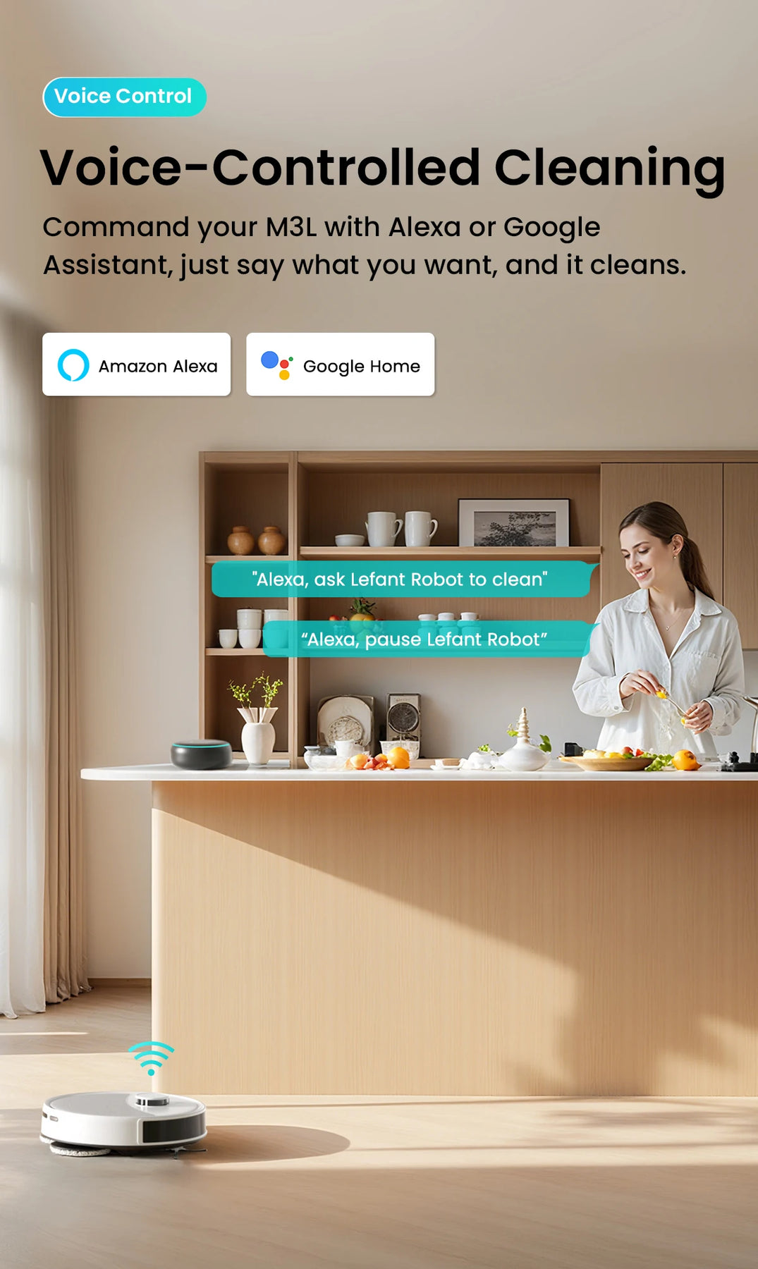 Command your M3L with Alexa or GoogleAssistant,just say what you want, and it cleans.